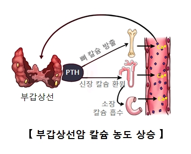 부갑상선 기능항진증은 부갑상선호르몬이 과잉분비되어 골격계에서는 칼슘을 혈중으로 분해하며 신장과 위장관계에서는 칼슘이 재흡수되어 고칼슘혈증을 나타냅니다. 전신적으로 권태감이 있으며 근력이 저하되고, 신장을 통한 다량의 칼슘 배설 때문에 신장의 합병증이 유발됩니다.