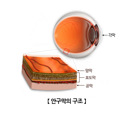 각막을 제외한 안구의 바깥층을 구성하는 외막으로 불투명한 흰색을 띄고 있으며, 안구 앞쪽에서는 투명한 결막으로 덮여 있고 뒤쪽에서는 안구의 가장 바깥층을 차지하고 있습니다. 공막에는 안구를 움직이는 6개의 작은 근육이 부착되어 있어 안구를 자유로운 방향으로 움직일 수 있도록 합니다. 뒤쪽으로는 시신경을 둘러싸는 막과 연결되어 있습니다. 공막은 다른 신체부위처럼 혈관 분포가 많지 않고 대사가 활발하지 않아 다른 조직에 비해 질환 발생이 드문 편입니다.