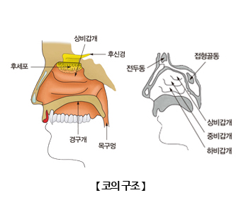 비강의 외측벽에는 상비갑개, 중비갑개, 하비갑개가 존재하는데 이 공간을 거치면서 공기는 점액이 풍부한 비점막과 접촉하면서 온도와 습기를 얻게 되고 불순물까지 제거됩니다. 코 점막의 상피에는 섬모가 존재하며, 섬모의 운동으로 콧속의 이물질이나 점액이 인두로 운반됩니다.