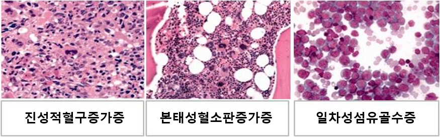 골수증식종양에는 진성 적혈구 증가증, 만성 골수성 백혈병, 본태성 혈소판 증가증, 일차성 골수섬유증의 4가지 병형이 있습니다. 진성 적혈구 증가증은 적혈구가 현저하게 증가하는 질환이며, 본태성 혈소판 증가증은 혈소판이 현저하게 증가하는 질환입니다. 일차성 골수섬유증은 골수의 섬유화로 인해 조혈 작용이 정상적으로 이루어지지 않는 질환입니다. 이 때문에 비장 등 골수 이외의 곳에서 조혈 작용이 발생하여 혈액이 만들어집니다.